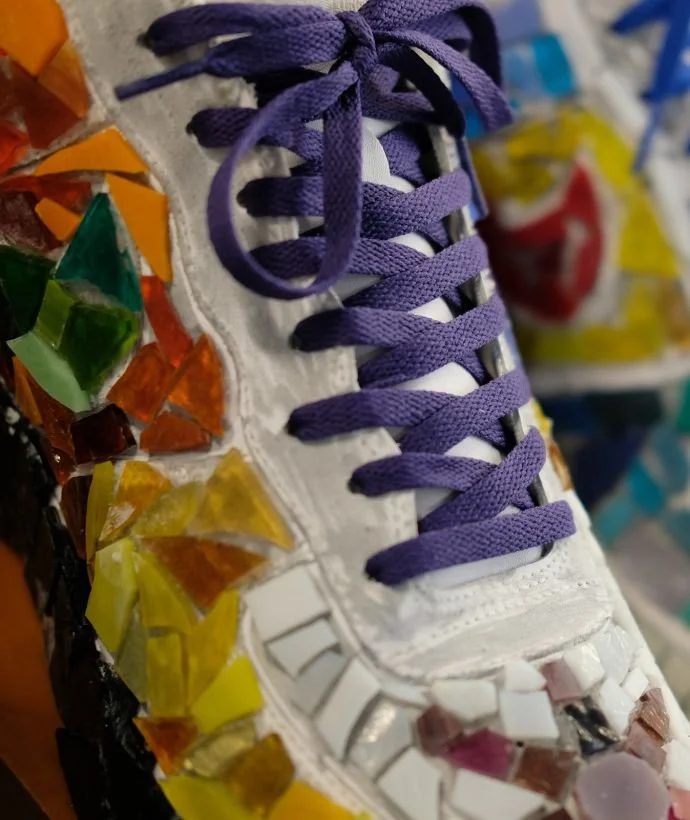 Divided into groups, the team took on the task of adding mosaic glass to four gigantic size 18 Nike® Air Force 1 shoes during their recent offsite here at the Makerspace, each creating its own unique and colorful design. And the final work will be unveiled at the Holiday Bizarre onstage at 7 p.m. Join us for the fun. High fives will be encouraged! (photo credit: mirifoto)